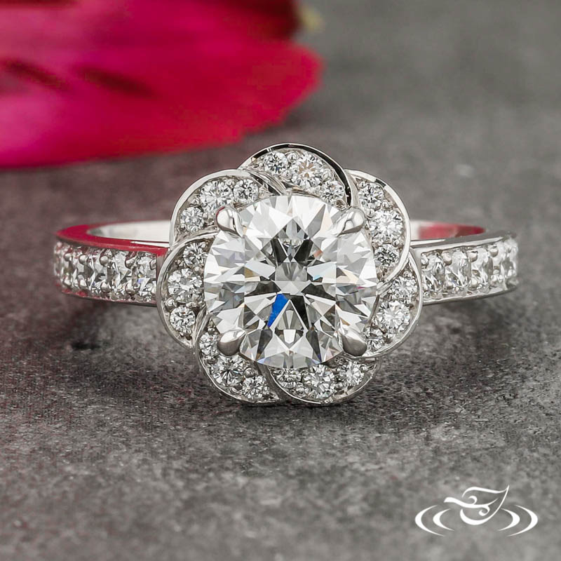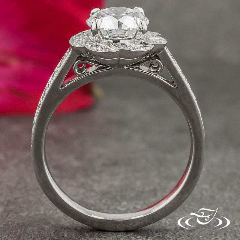 Custom 950 platinum ring holding a 4-prong set GLJW provided round diamond center stone. Expertly crafted with handmade fine wire filigree curls on the sides. This ring also has a Scalloped style halo and bead set diamonds halfway down the shank with a high polish finish.
