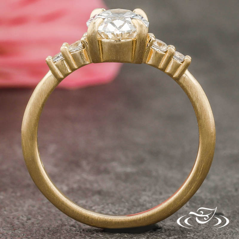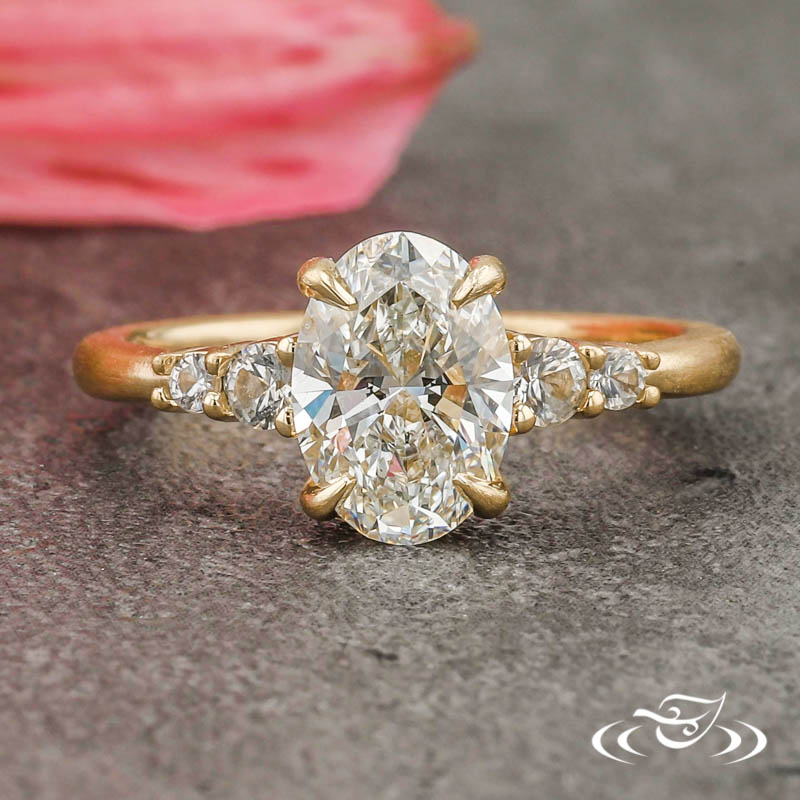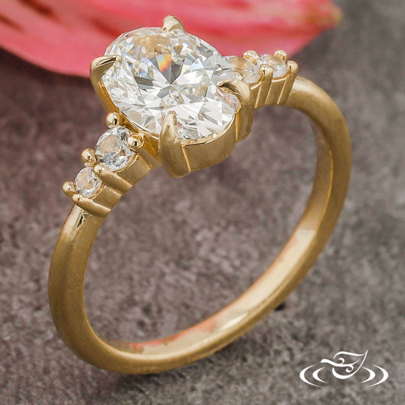 Custom 14kt yellow gold ring holding (1) GLJW provided oval cut lab diamond center stone 4-prong set with low profile teardrop prongs. The shoulders are each accented by (2) shared prong set GLJW provided round cut white sapphire melee. This ring has a round shank and a satin finish.