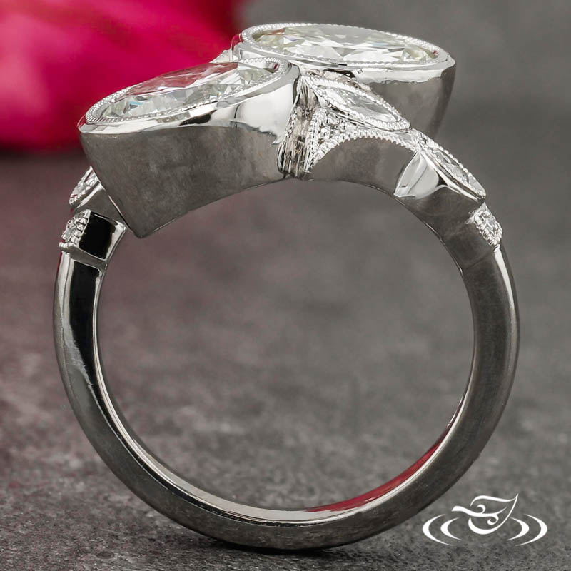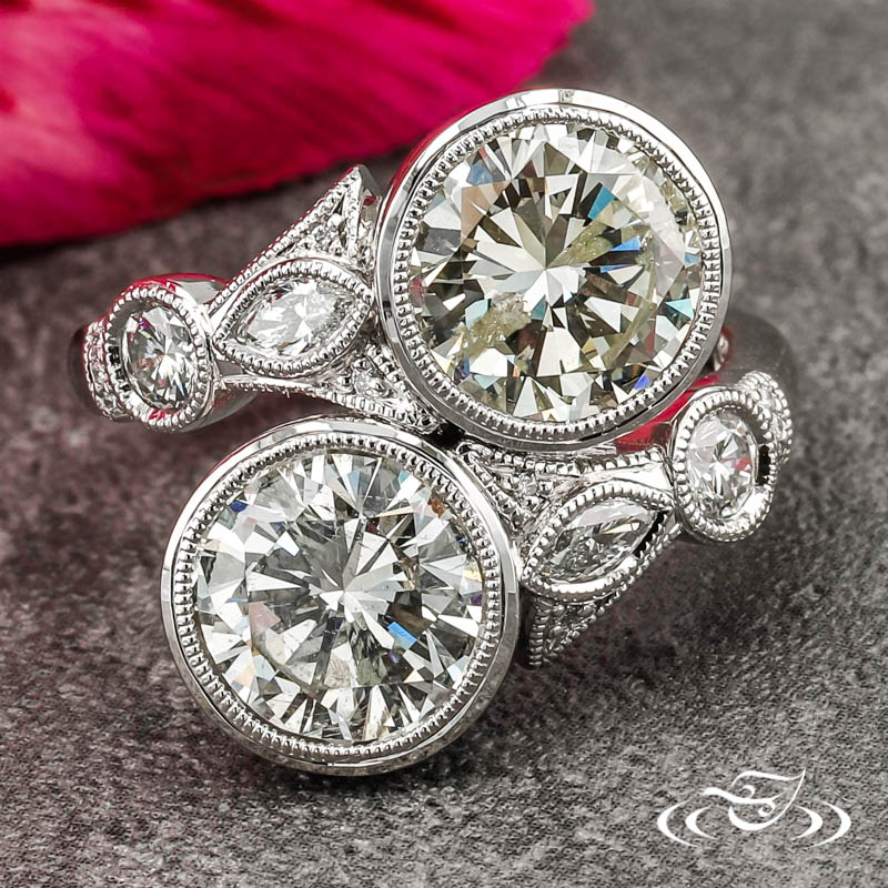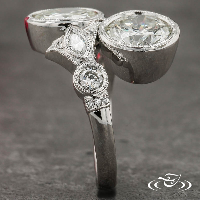 Custom 950 platinum Toi et Moi style ring holding (2) bezel set round cut diamond center stones, (1) GLJW provided and (1) customer provided. Each shoulder has a vintage-inspired leaf motif with raised milgrain outer detailing. Each leaf holds (1) bezel set GLJW provided marquise cut diamond melee and (2) bead set GLJW provided round cut diamond melee. Following the leaves, on each side, is (1) bezel set customer provided round cut diamond melee and a raised horizontal ribbon with (3) bead set GLJW provided round cut diamond melee. Both elements again framed in milgrain. This ring has a round shank and a high polish finish.