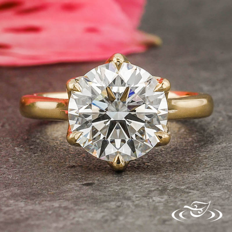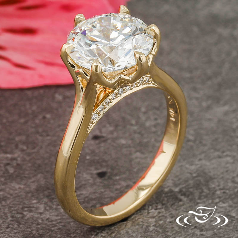 Custom 14kt yellow gold ring holding a GLJW provided round lab diamond center stone in lotus style basket. This jewelry also has a cathedral shank with diamonds set in the bridge and a high polish finish.