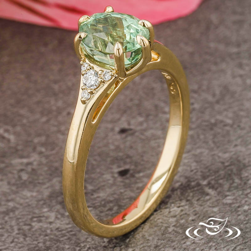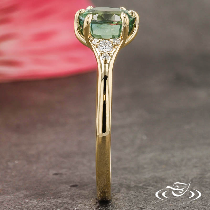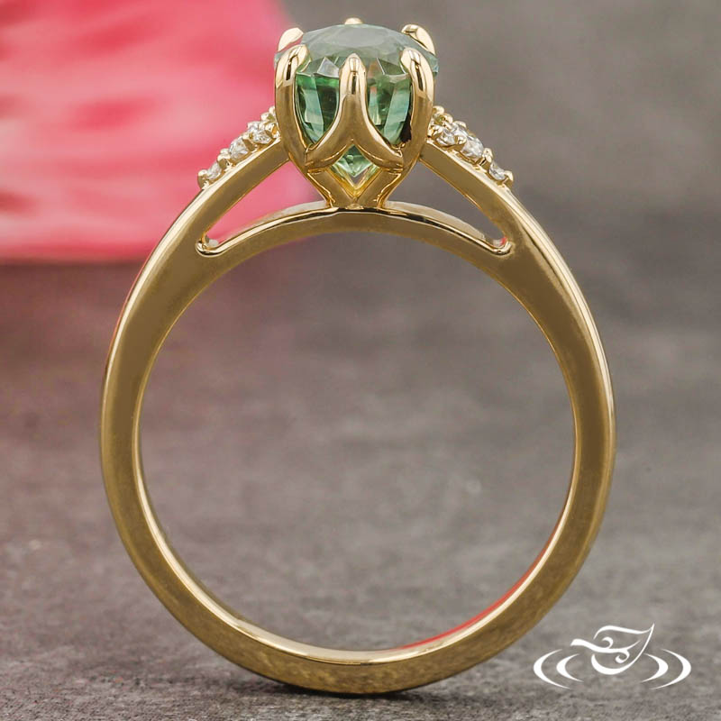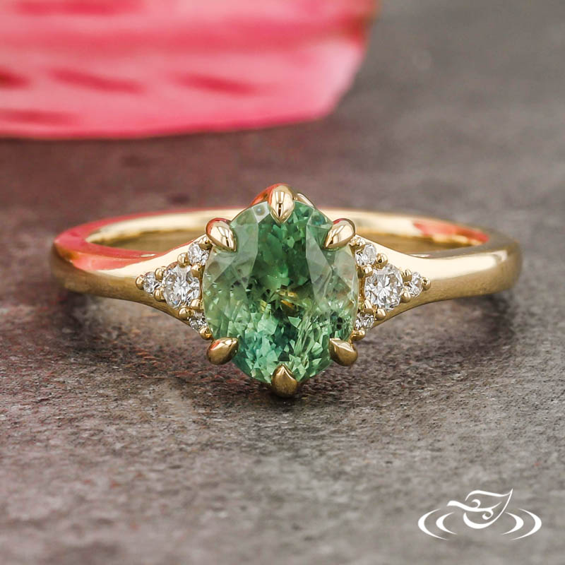 Custom 14kt yellow gold ring holding (1) 6-prong set GLJW provided oval cut green Montana sapphire center stone. Each shoulder is accented by (4) bead set GLJW provided round cut lab diamond melee set in a triangular formation. This ring has tapered shoulders, a round domed profile, and a high polish finish.