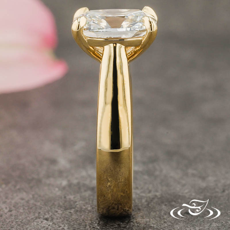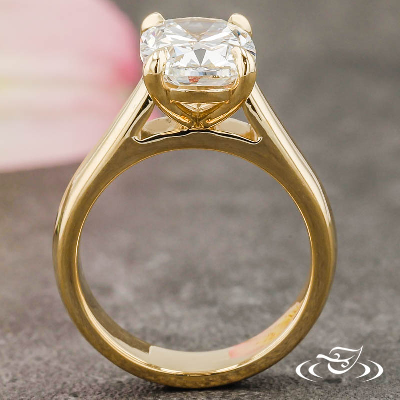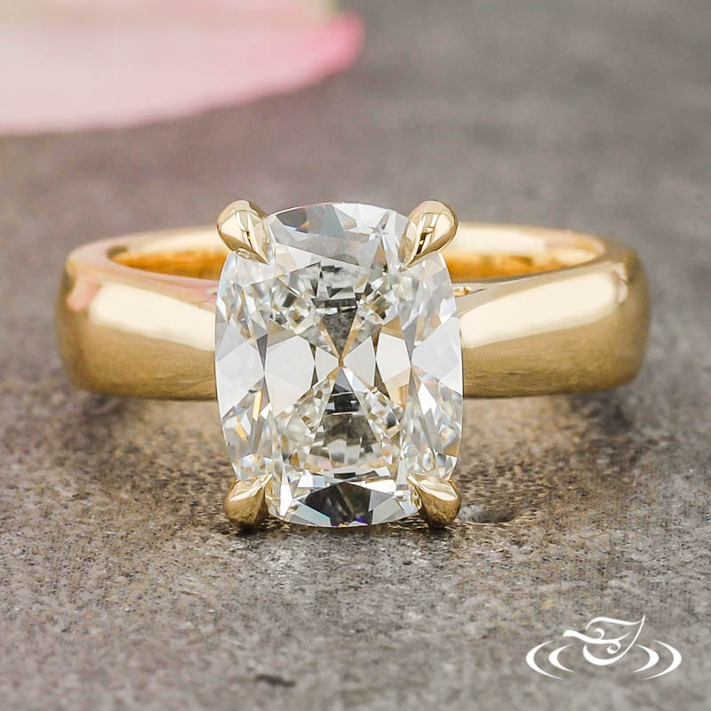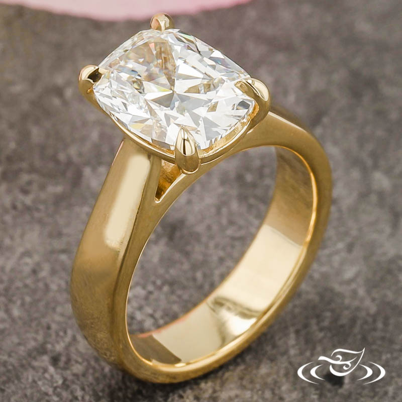 Custom 18kt yellow gold solitaire ring holding (1) 4-prong set GLJW provided cushion cut lab diamond center stone. This ring has a reversely tapered wide shank, soft domed profile, and a high polish finish.