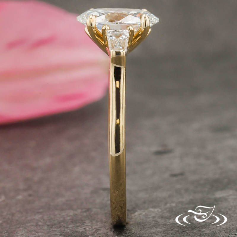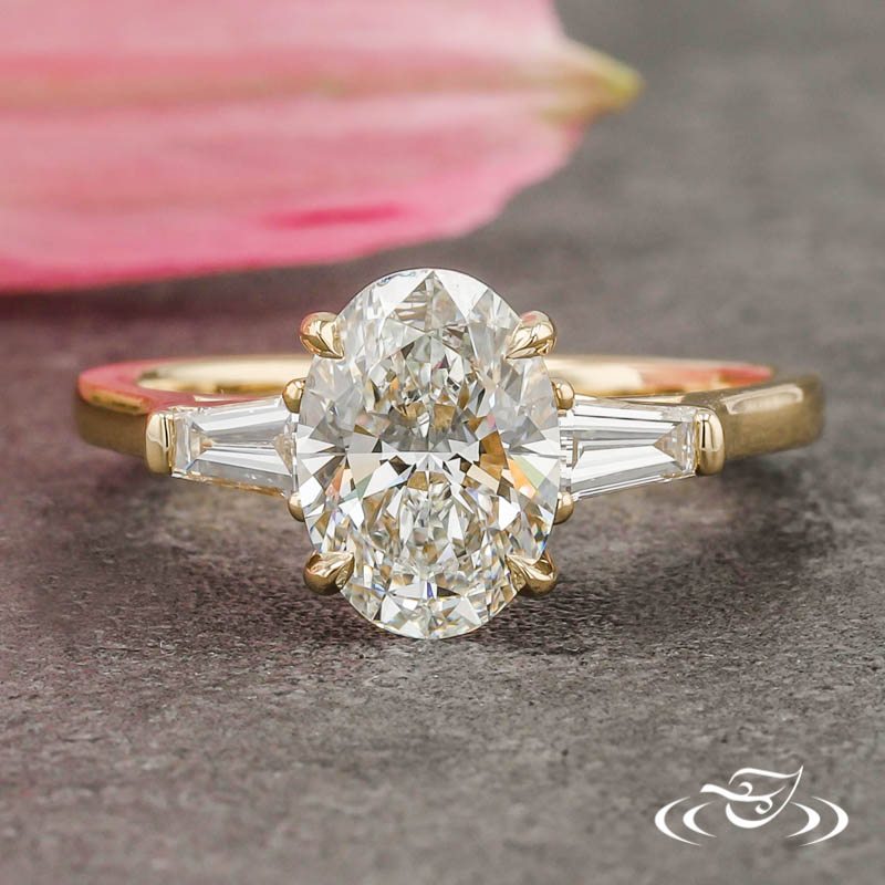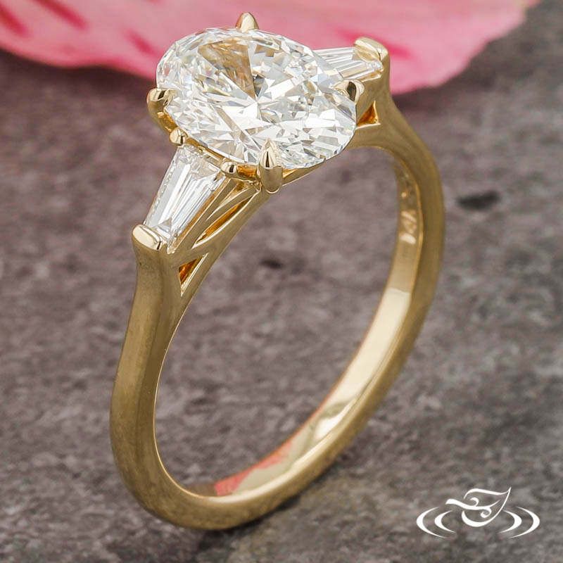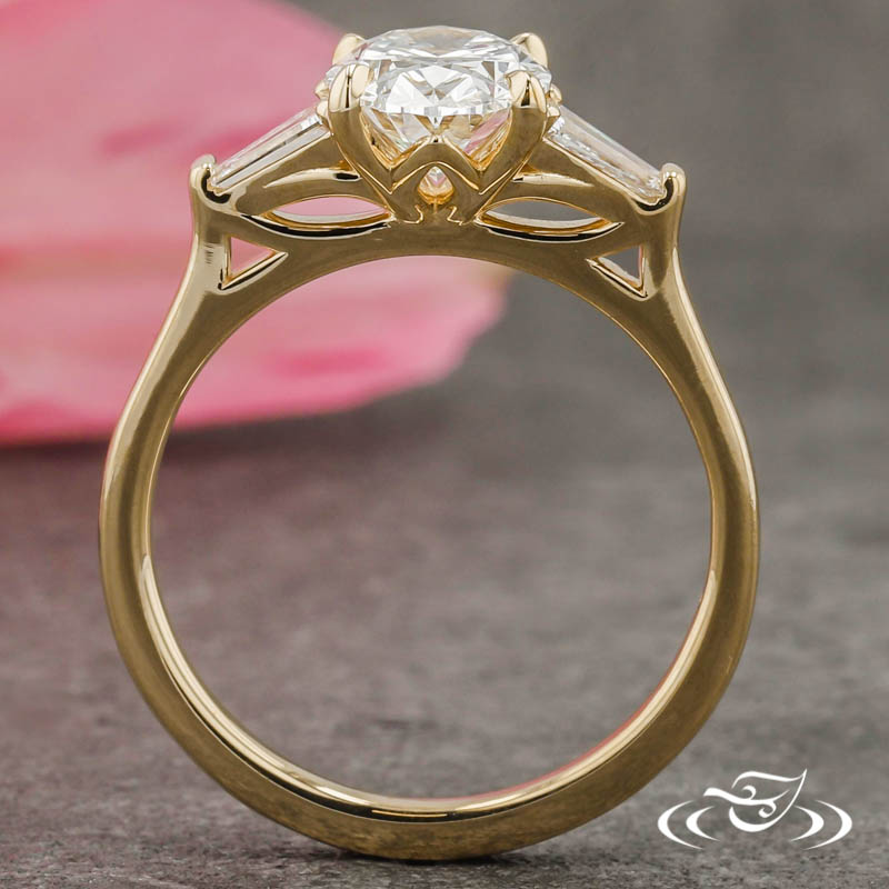 Custom 14kt yellow gold ring holding (1) 4-prong set GLJW provided oval cut lab diamond center stone flanked by (2) bar set GLJW provided tapered baguette cut lab diamond accent stones. This ring has a pierced lotus motif on the side faces of the settings, a round domed shank, and a high polish finish.