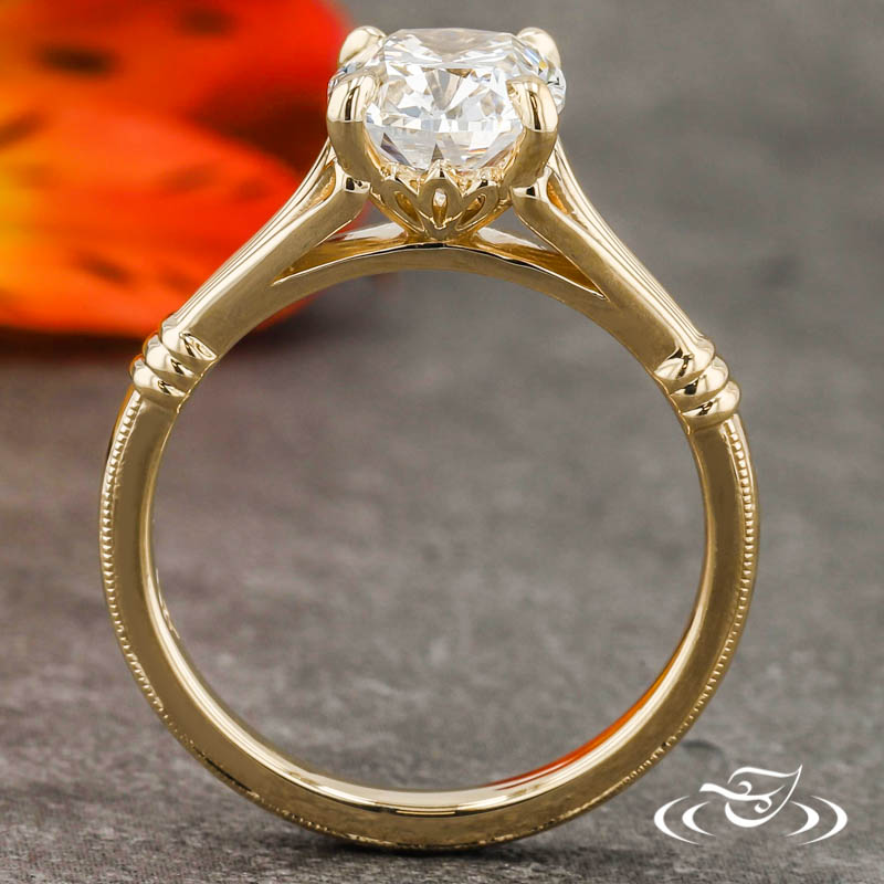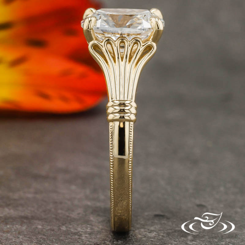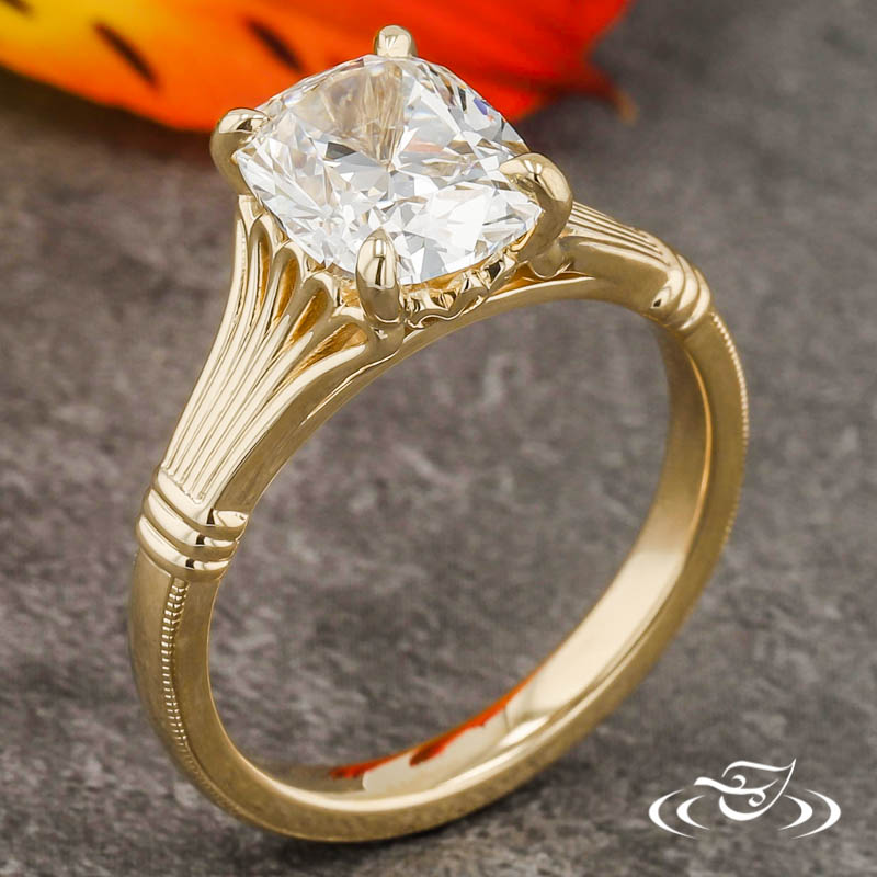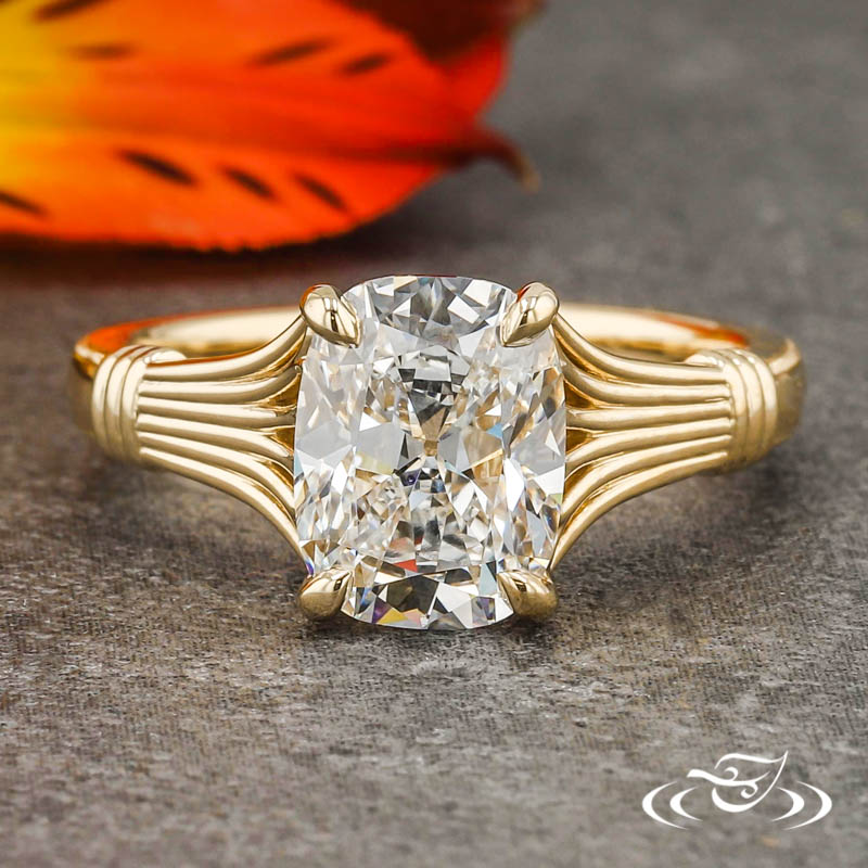Custom 14kt yellow gold solitaire ring holding (1) GLJW provided cushion shaped mine cut lab diamond center stone 4-prong set with claw shaped prongs. The Cathedral shoulders have a pierced fluted design that are separated from the remainder of the round domed shank by (2) horizontal raised bars. The remainder of the round shank is accented by milgrain edges. All with a bright high polish finish.