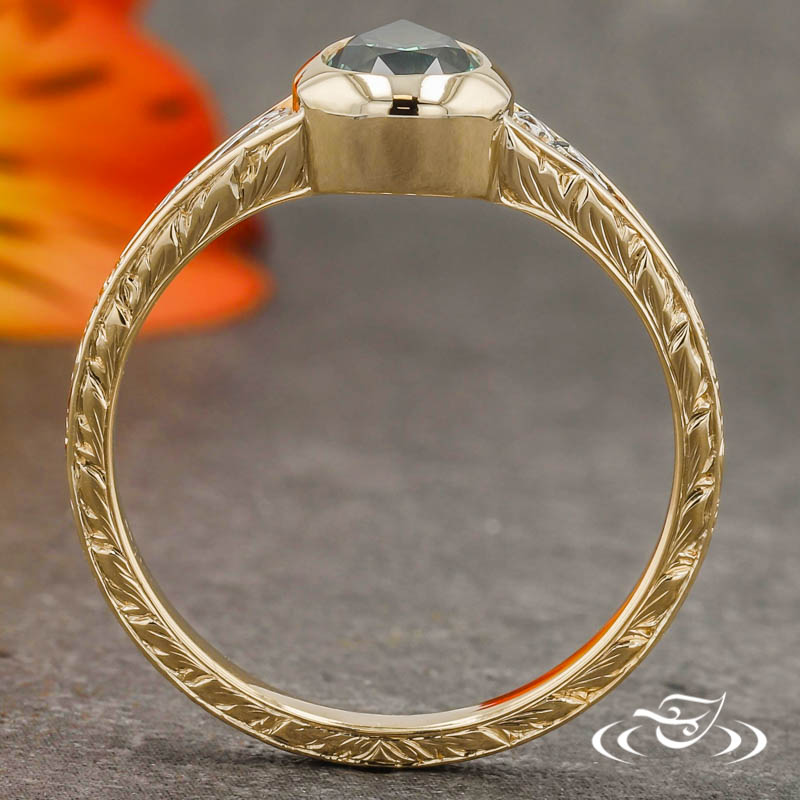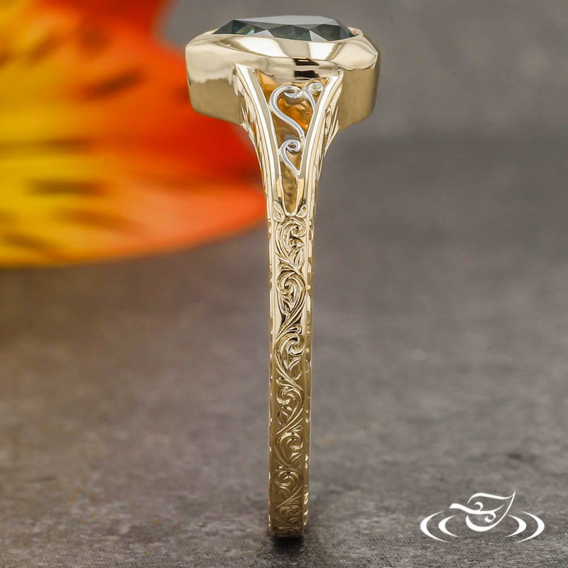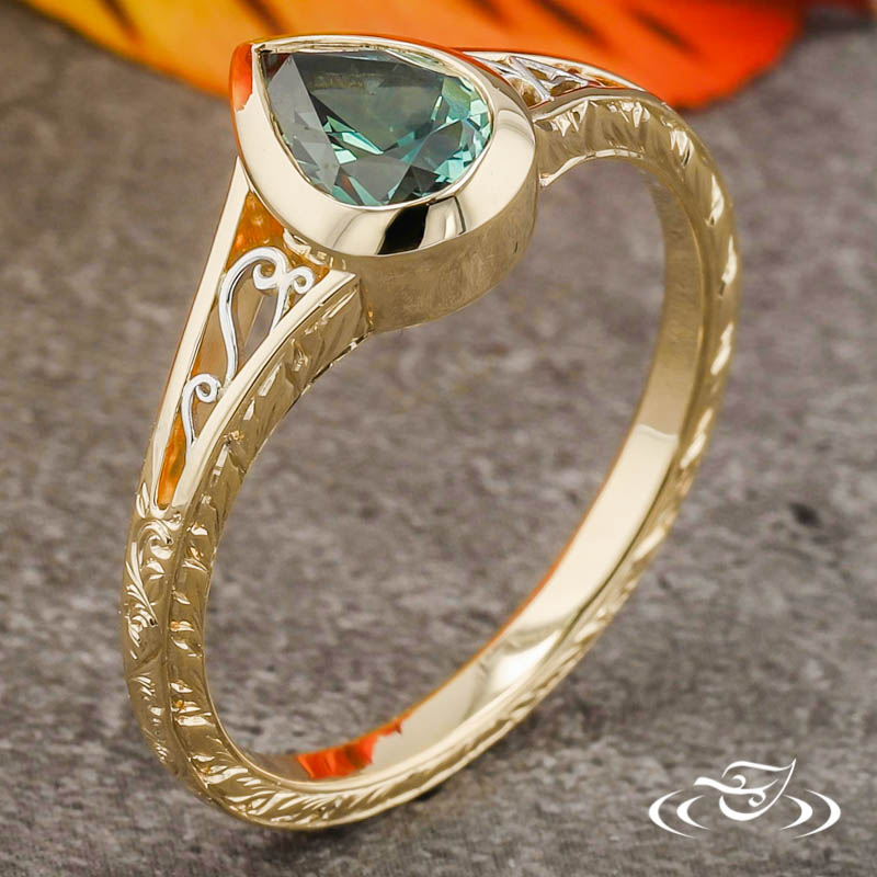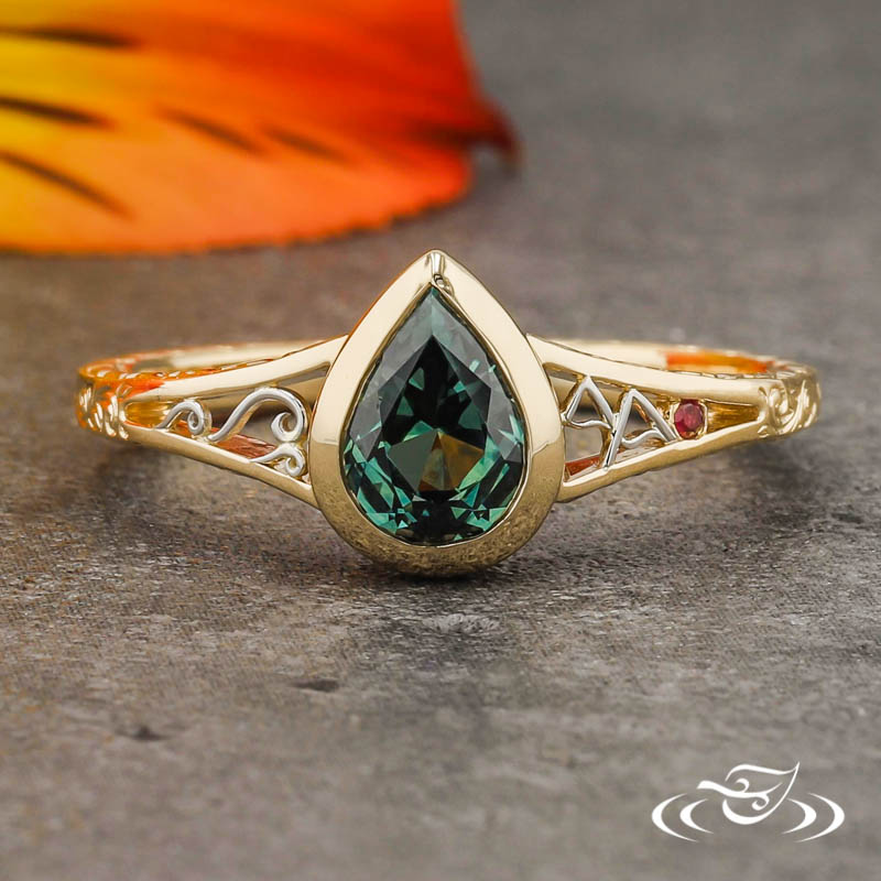 Custom 14kt yellow gold ring holding (1) bezel set GLJW provided pear cut teal Montana sapphire center stone. The split tapered shoulders are filled with 950 platinum hand fabricated filigree. One shoulder has (3) filigree curls while the other has (2) filigree mountains with (1) bezel set GLJW provided round cut ruby melee. The remainder of the round shank is accented by hand engraved scroll patterning on the top face and hand engraved half wheat patterning on both side faces. All with a high polish finish.