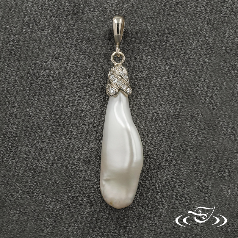 Custom 14kt white gold pendant holding a customer provided irregular pearl center stone and (24) bead set customer provied round diamonds.