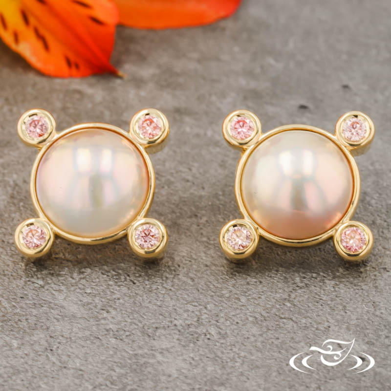 Custom Pair of 18kt yellow gold earring. (4) GLJW provided round lab diamond stones bezel set N.S.E.W of (2) Customer Provided Bezel Set Pearls. These earrings also have friction post/backs and a high polish finish.