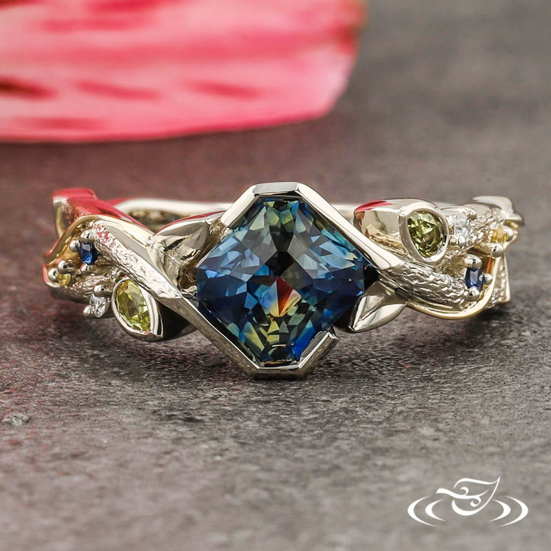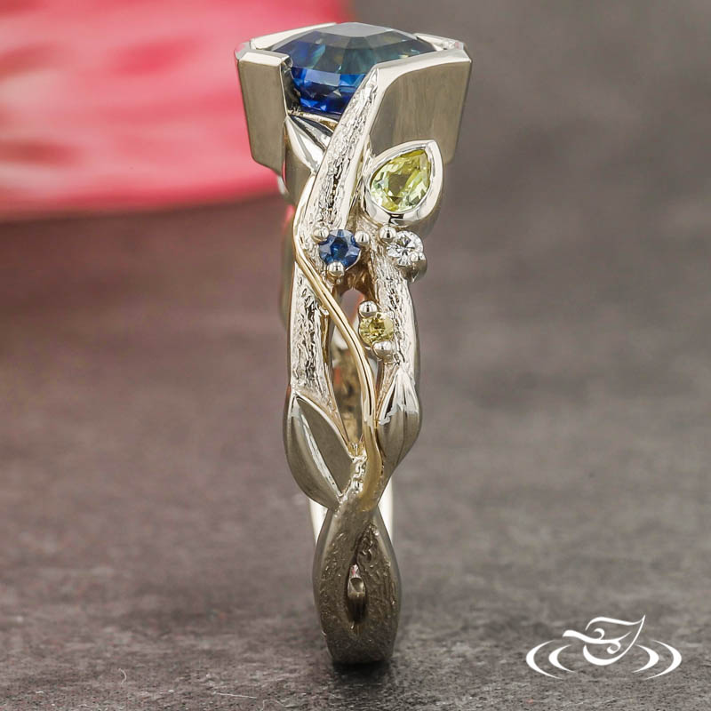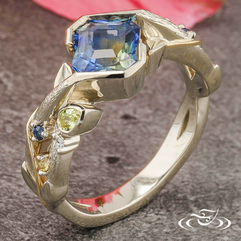 Custom 14k white gold ring holding (1) wrap set customer provided radiant cut bi-color sapphire center stone. The round shank has a double strand twist motif with cast in place leaves. On each side of the ring sits (1) bezel set GLJW provided pear cut yellow sapphire melee, (1) prong set GLJW provided round cut blue sapphire melee, (1) prong set GLJW provided round cut yellow sapphire melee, and (1) prong set GLJW provided round cut diamond melee. A hand fabricated 14k yellow gold wire wraps from each shoulder and crosses over the openings between the strand twists. This ring has a hand engraved tree bark texture on the top face and a smooth high polish finish on the leaves and side faces.