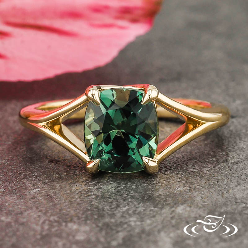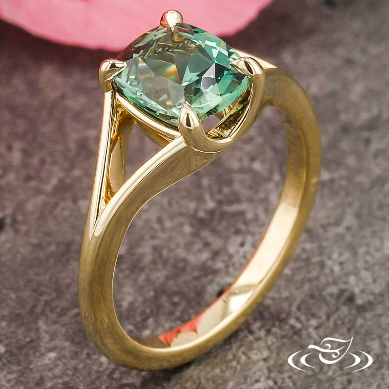 Custom 14kt yellow gold ring holding a 4-prong set customer provided cushion sapphire center stone. This ring also has a split shank and a high polish finish.