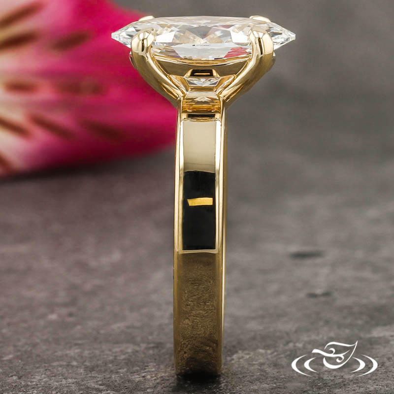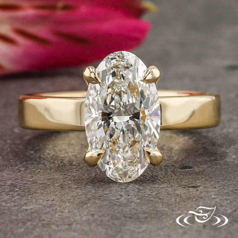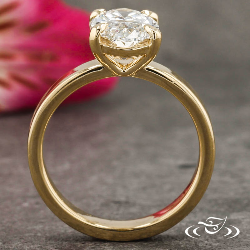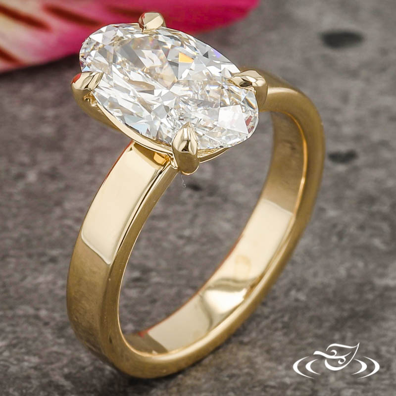 Custom 14kt yellow gold solitaire ring holding (1) GLJW provided oval cut lab diamond center stone 4-prong set with pointed prongs. This ring has a round shank with a flat comfort fit profile and a high polish finish.