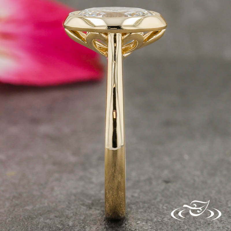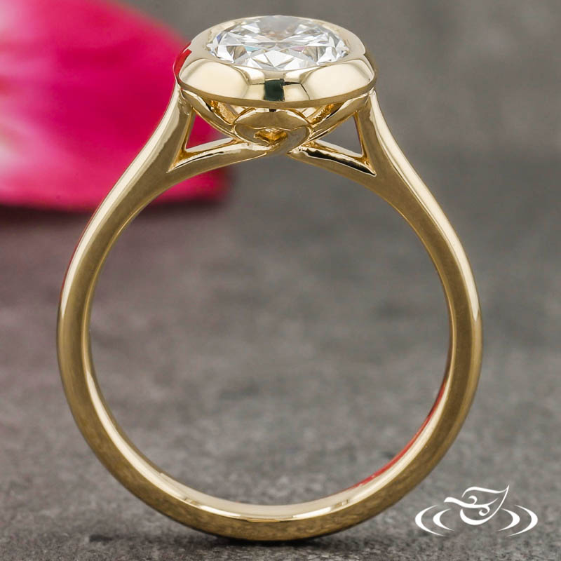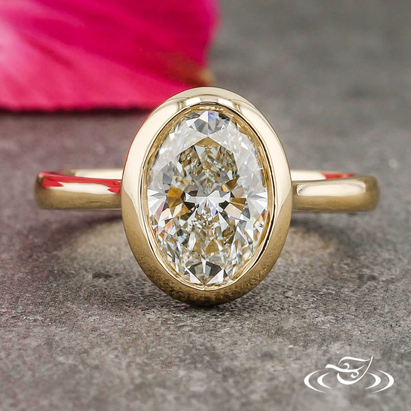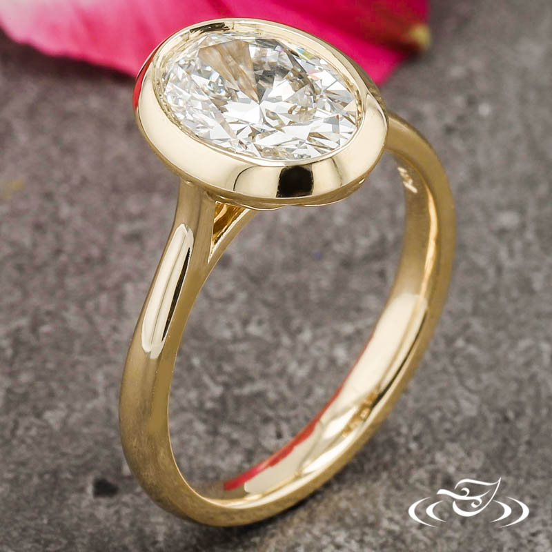 Custom 14kt yellow gold solitaire ring holding (1) bezel set GLJW provided oval cut lab diamond center stone. The center setting has a pierced petal-inspired motif on the undergallery. This ring has a reversely tapered round domed shank and a high polish finish.