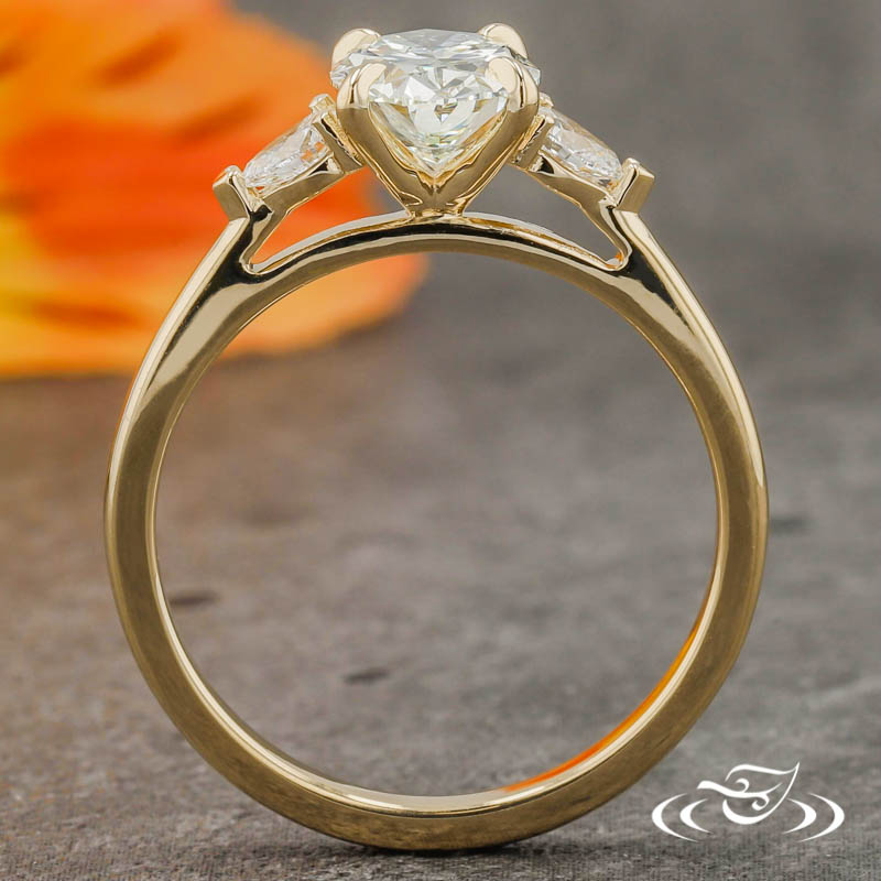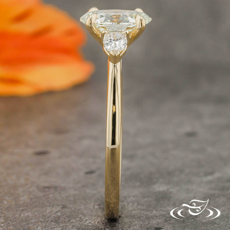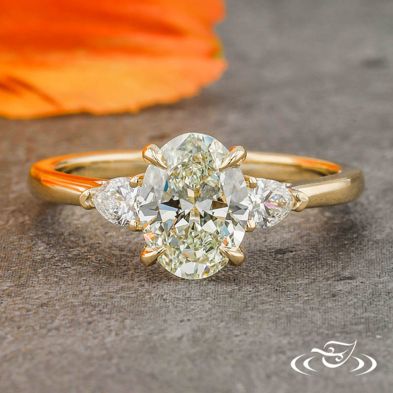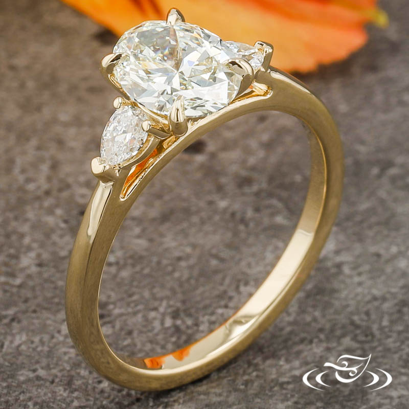 Custom 14kt yellow gold ring holding a 4-prong set GLJW provided Oval lab diamond center stone with Pear Lab Diamond Side stones on either side of the center. This ring also has a round shank and a high polish finish.