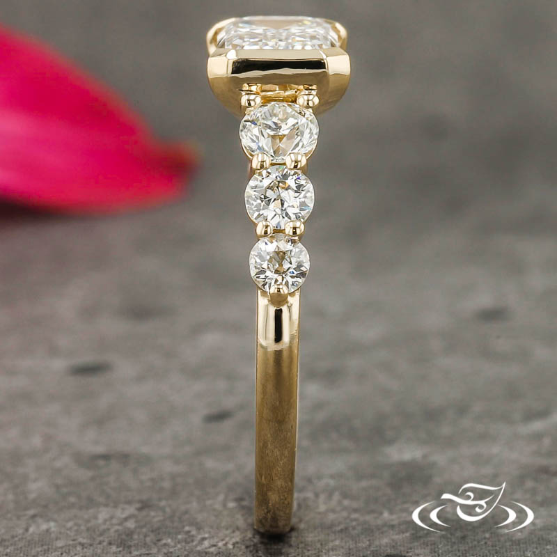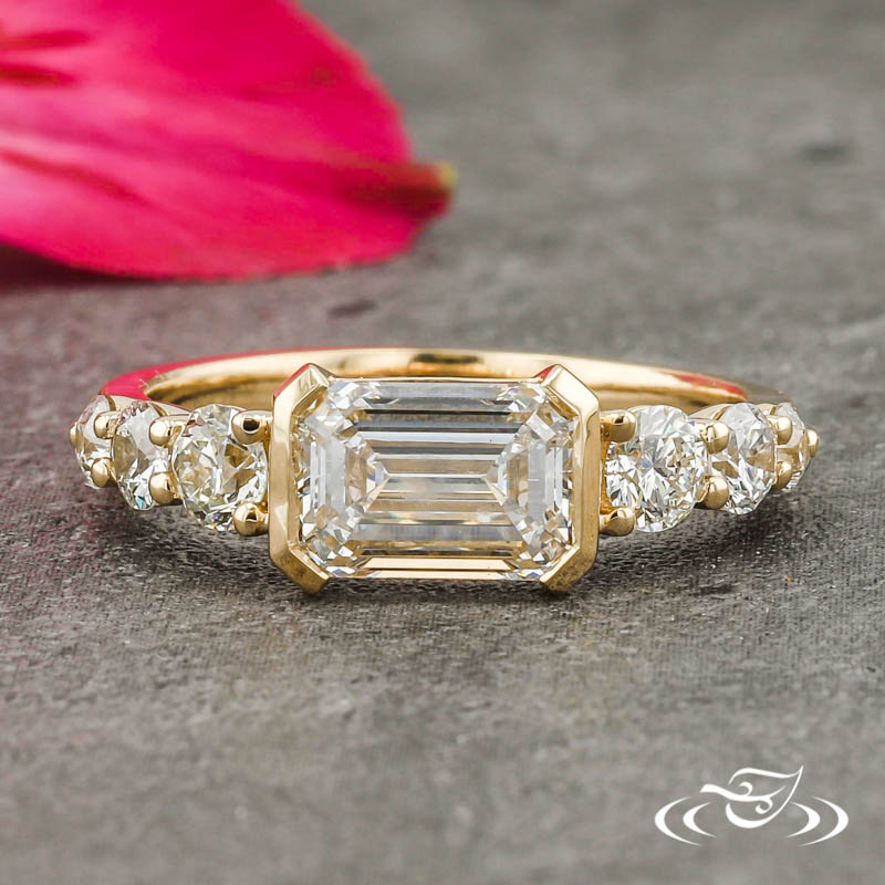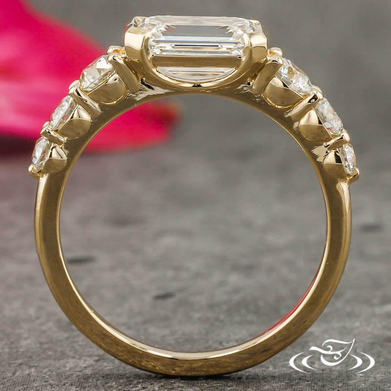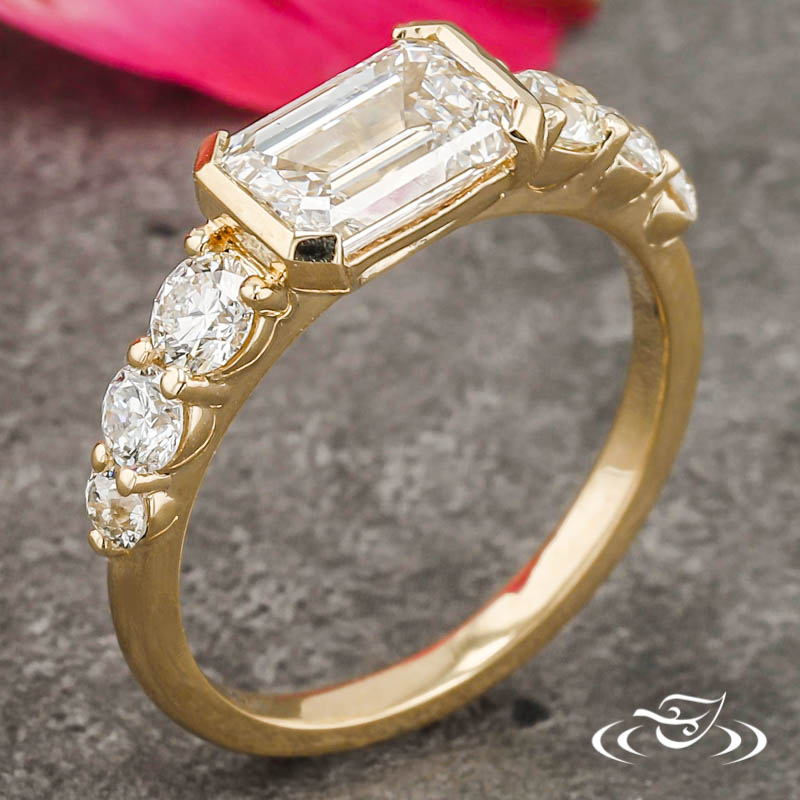 Custom 14kt yellow gold ring holding (1) GLJW provided emerald cut lab diamond center stone half bezel set lengthwise from east to west. On each shoulder is a cascade of (3) shared prong set round cut diamond accent stones, set in graduating size order with the largest (2) stones flanking the center. The remainder of the ring has a round domed shank. All with a high polish finish.