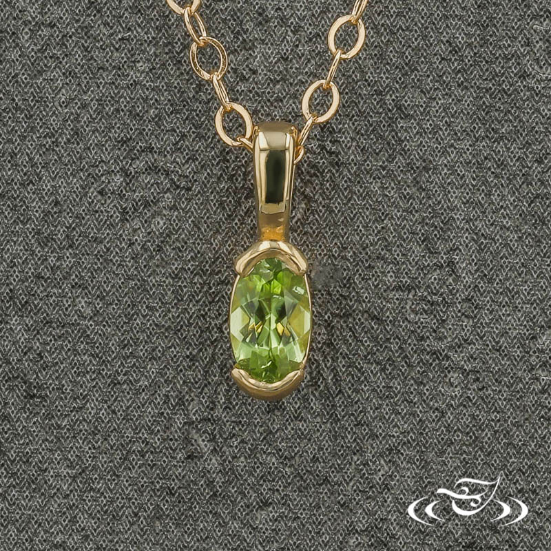 Custom assembled 14k yellow gold pendant holding (1) GLJW provided oval cut Arizona peridot center stone half bezel set lengthwise vertically. This pendant has a slightly tapered bail at the top and a high polish finish.