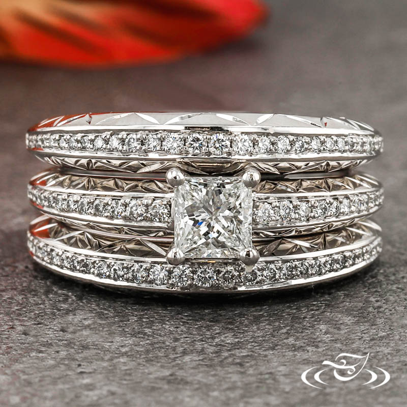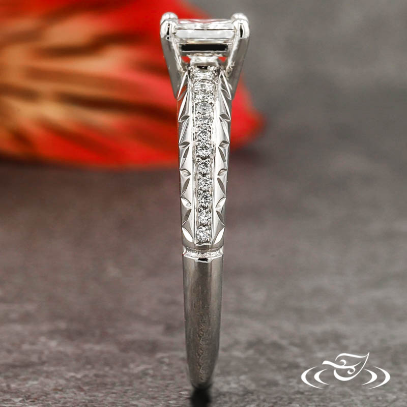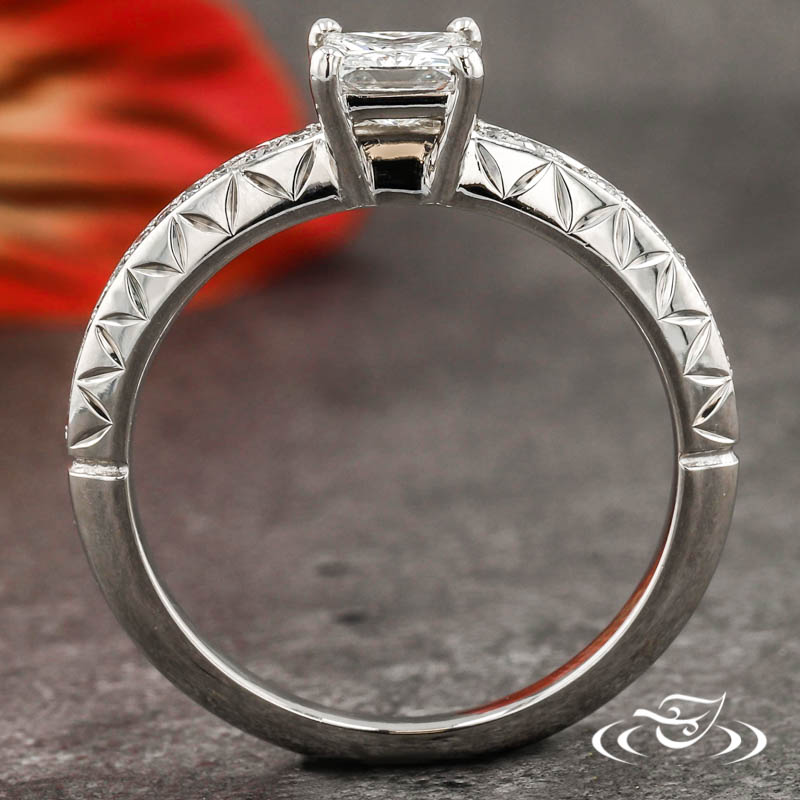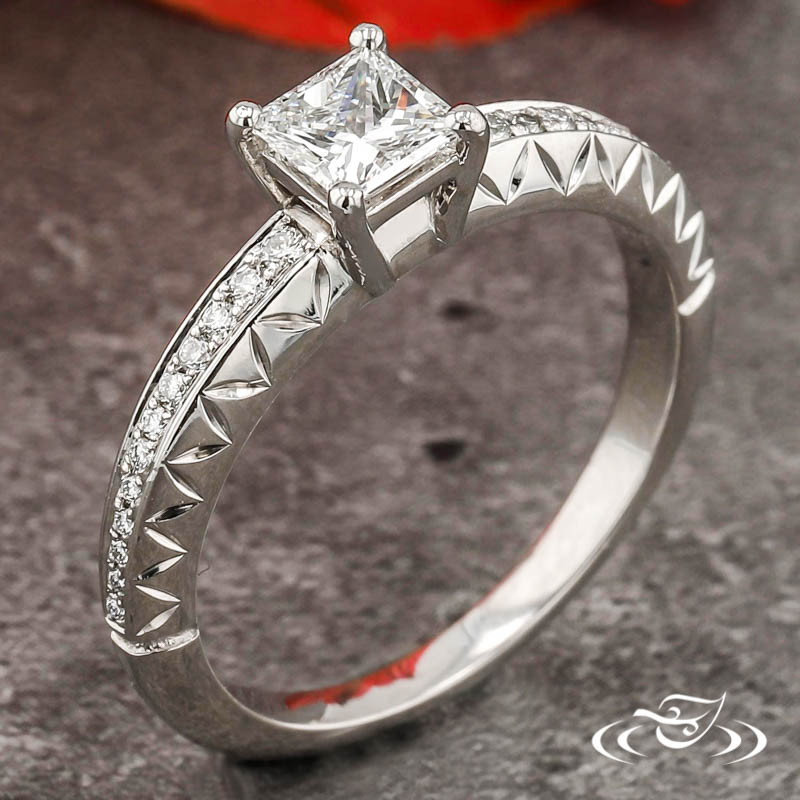 Custom 950 platinum ring holding (1) 4-prong set customer provided princess cut diamond center stone. The round tapering shank has a high domed profile with a total of (12) customer and GLJW provided round cut diamond melee bead set down the center of the top face on each side. A hand engraved zig-zag pattern accents both sides faces of the domed shank and end at the same ~halfway mark as the stones. All with a high polish finish.