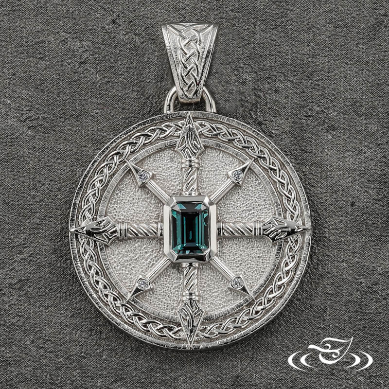 Custom 950 platinum disc shaped pendant with a cast-in-place raised compass rose inspired detailing in the center and a raised braided pattern around the edges. (1) Customer provided emerald cut alexandrite is bezel set in the center. A The pendant hangs from a tapered bail at the top via a platinum jump ring. This pendant has a mixed bead blast and high polish finish.