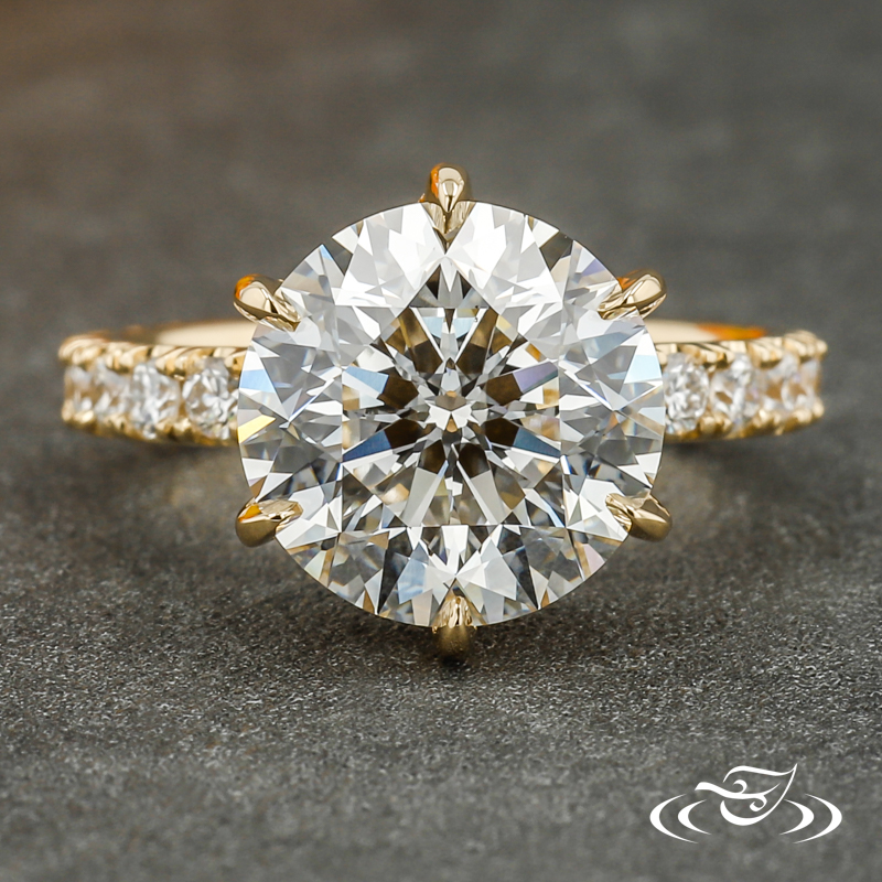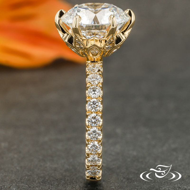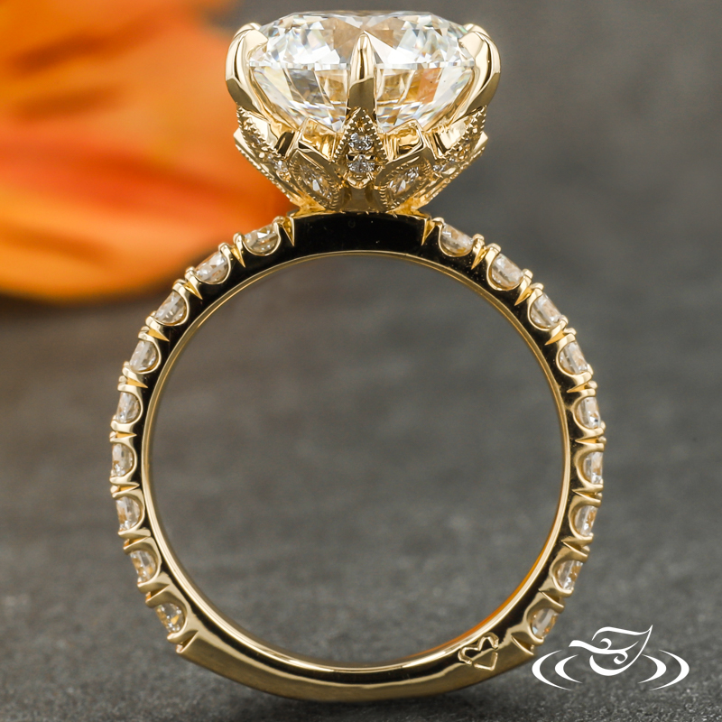 Custom 18kt yellow gold solitaire ring holding a 6-prong set GLJW provided round lab diamond center stone with (18) GLJW provided round lab diamonds fishtail set on the shank going about 3/4 of the way around the shank. This ring also features a decorative hidden halo with (12) GLJW provided round lab diamonds and (6) GLJW provided marquise lab diamonds bezel set and highlighted with milgrain edges. A hand engraved stylized heart on the side face completes this design. All with a round euro shank and a high polish finish.