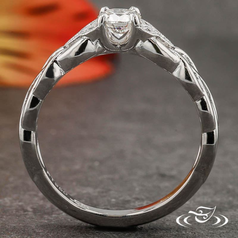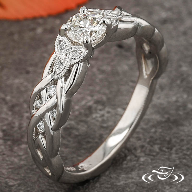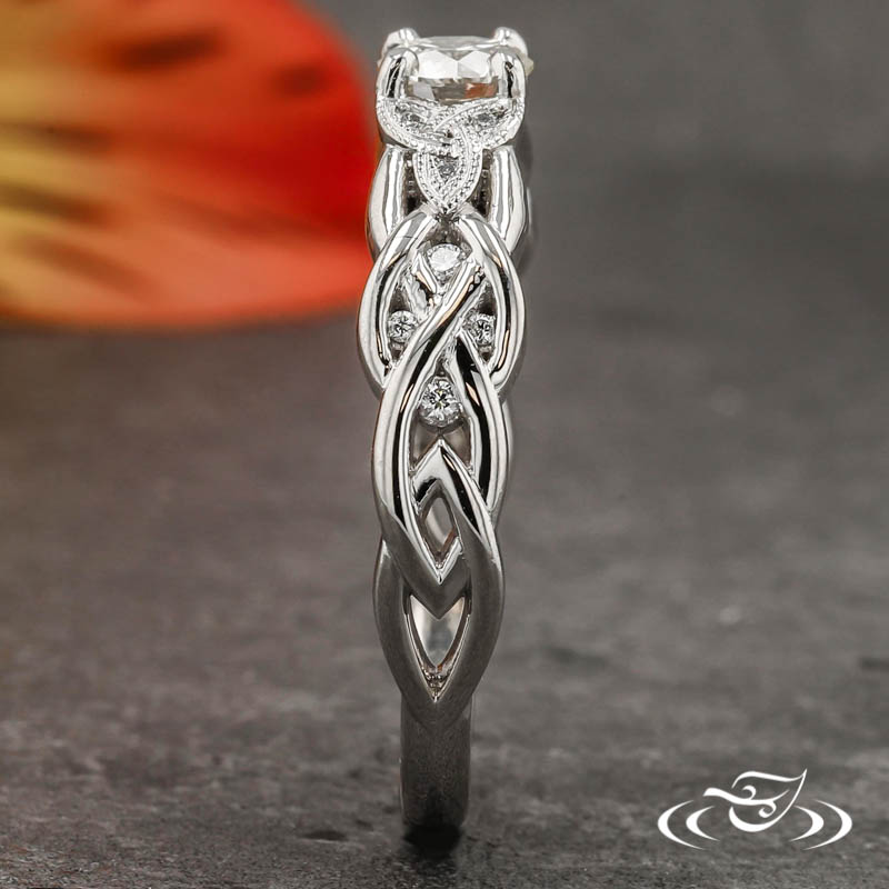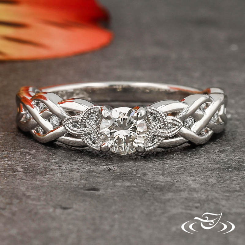 Custom 950 platinum ring holding (1) 4-prong set customer provided round cut diamond center stone. Each shoulder is accented by a pierced trinity knot with double milgrain edges and (3) channel set GLJW provided round cut diamond melee. A multi-strand woven motif extends partway down both sides of the shank with an additional (4) GLJW provided round cut diamond melee channel set within the pierced openings on each side. The bottom ~third of the shank has a solid domed profile. All with a high polish finish.
