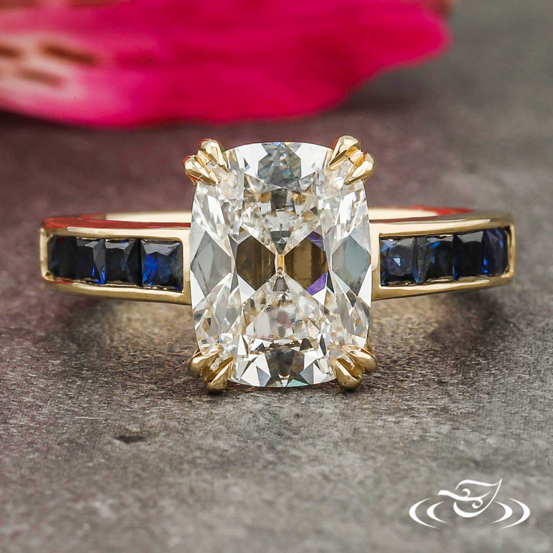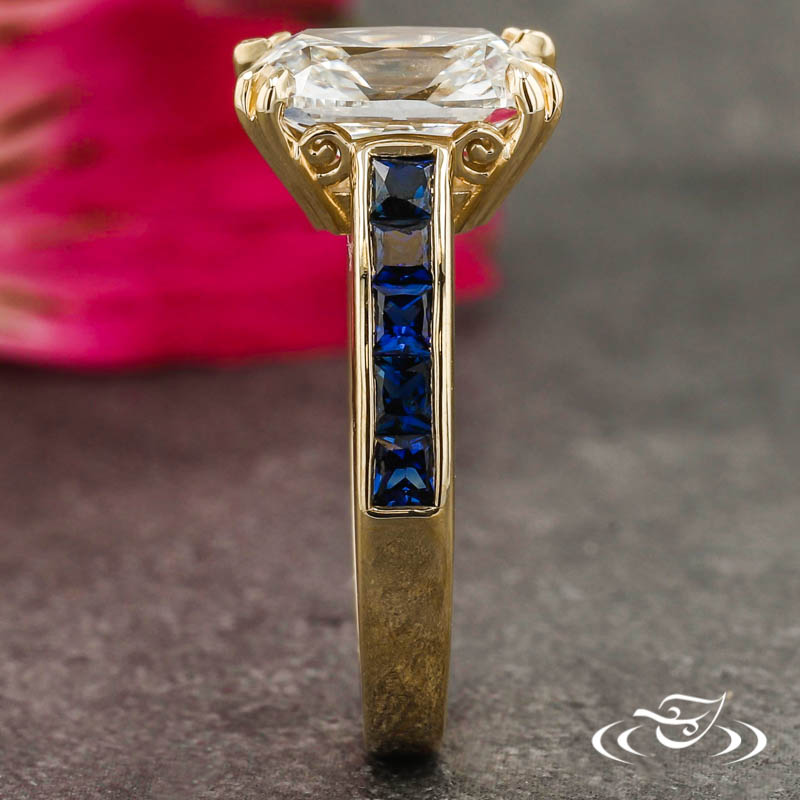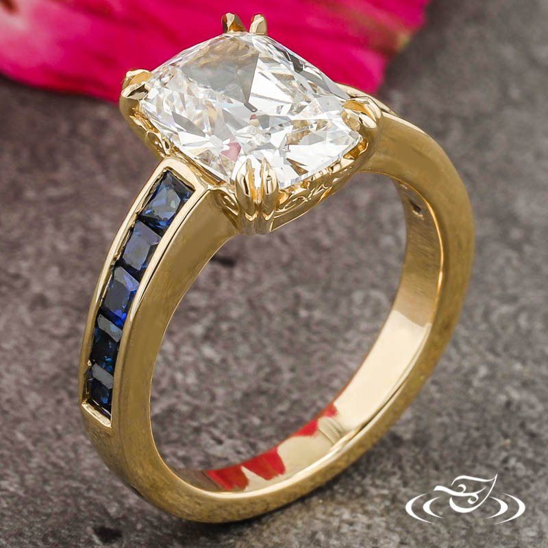 Custom 14kt yellow gold ring holding a double claw prong set GLJW provided cushion lab diamond center stone in a decorative basket. This ring also has a round straight taper shank with channel set princess cut blue sapphires halfway around and a high polish finish.