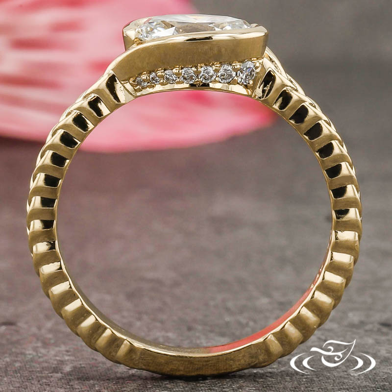 Custom 14kt yellow gold ring holding (1) GLJW provided oval cut lab diamond center stone wrap set lengthwise from east to west. The side faces of the wrap are accented by a total of (14) GLJW provided round cut lab diamond melee bead set in graduating size order. This ring has a round shank comprised of a braided motif, with a small plain sizing gap at the base. All with a high polish finish.