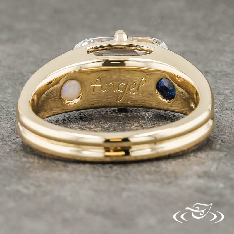 Custom 14kt yellow gold ring holding (1) customer provided cushion cut lab diamond center stone 4-prong set with delicate pointed prongs lengthwise from east to west. The tapering round domed shank has (1) central groove eternity style around the top face. This ring has (2) GLJW provided round cut stones flush set on the inside, (1) blue sapphire and (1) opal, flanking the hand engraved word "Angel". All with a high polish finish.