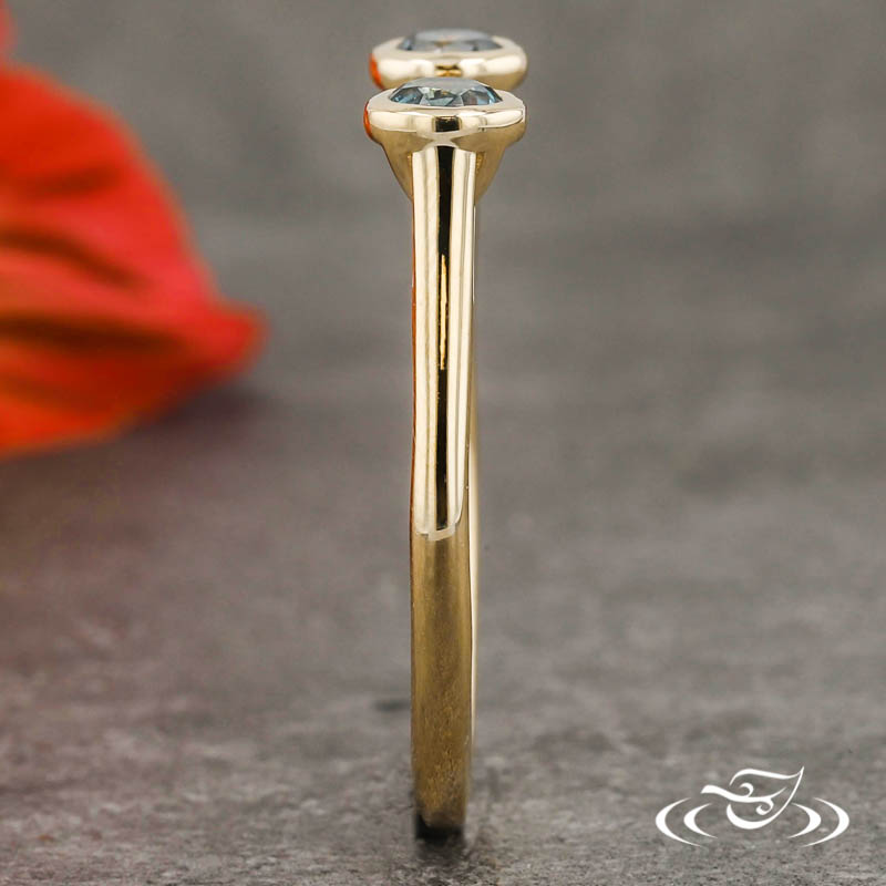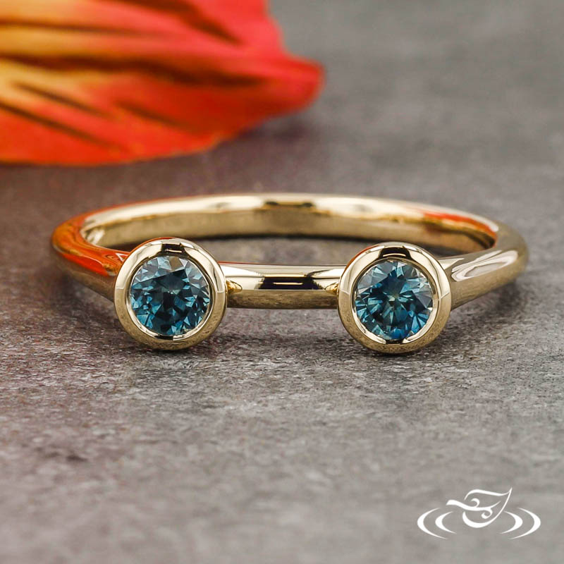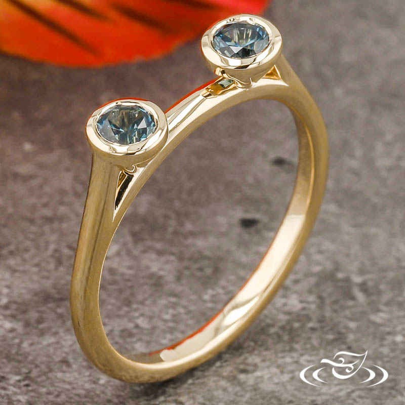 Custom 14kt yellow gold ring. (2)round montana sapphire stones bezel set on top face. This ring also has a round shank and a high polish finish.