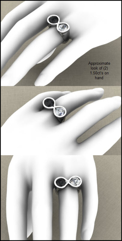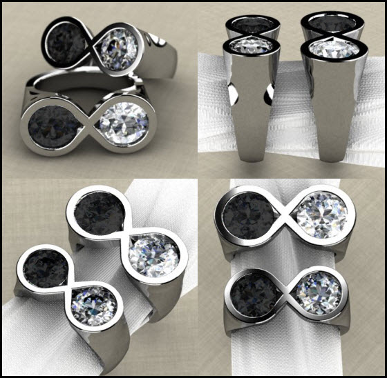 Here you can see the infinity design mocked up with two different stone sizes in each of the 3D CAD renderings, which helped this client decide which size diamond to choose for each stone.