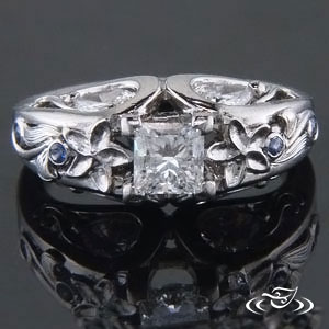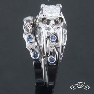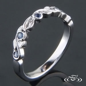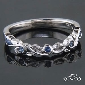 Custom 2-3mm wide carved and cast delicate leaf and vine organic wedding band, set with (5) 1.3mm round blue sapphires in the curls, and engraved details on leaves to match engagement ring. Polished, size 4.