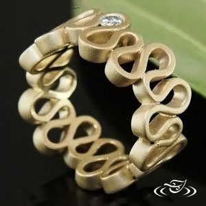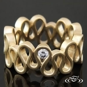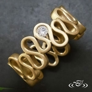 Custom 18kt yellow gold hand fabricated wavey band, approximately 4-6mm varying width, set with one round diamond on top. Size 5, matte finish.