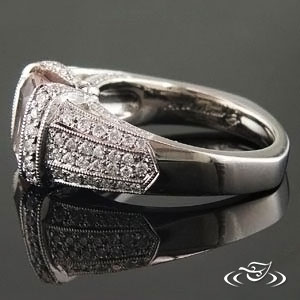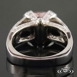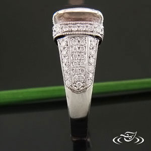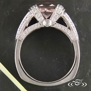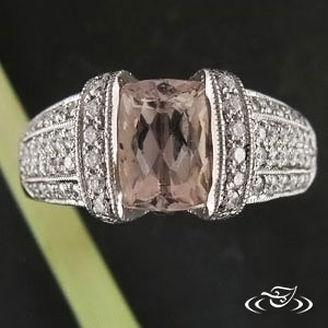 Custom half bezel Palladium 950 pave mounting, bead set with (104) pave set round diamonds, with milgrain lines between each section of pave. The center stone is a cushion cut pink morganite at ~8x6mm. Finished with a beautiful high polish shine!