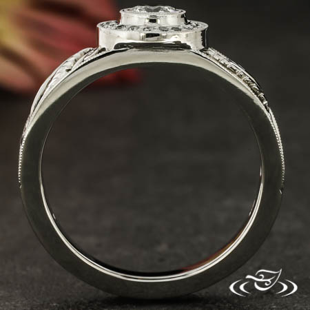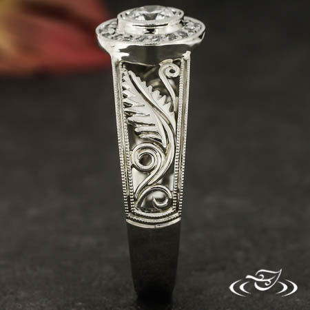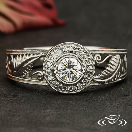Set with a .26ct Round brilliant center in a milirain bezel with (20) ~1mm diamonds on halo. Fern and curl filigree