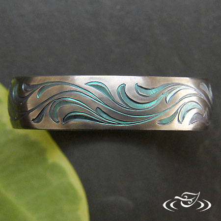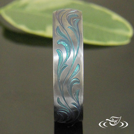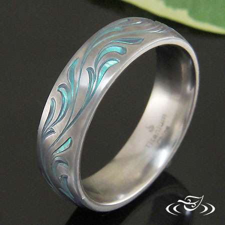 6mm wide domed comfort fit titanium band with loose scroll engraving anodized with blue/green *MATCH PICTURE*