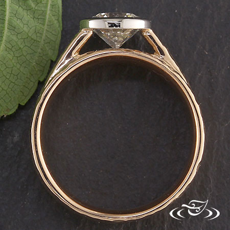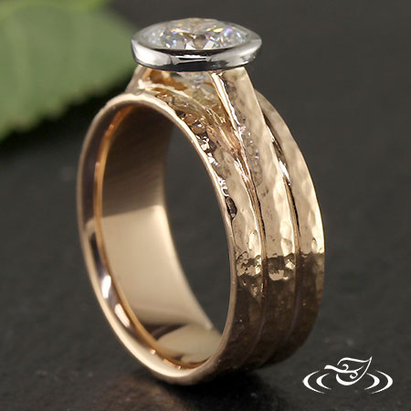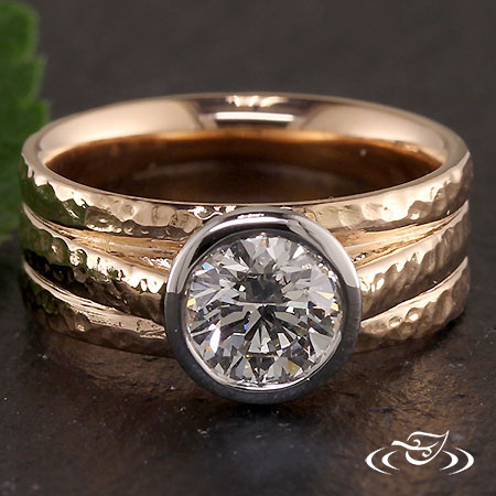 Custom 18kt rose gold 3-band mounting to hold a 1.10ct round brilliant cut diamond in a 950 platinum bezel. Cathedral style shoulders hold center head. triple ring style profile with small hammer texture.
