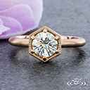 A hexagonal rose gold basket setting features a pierced Celtic pattern and milgrain edges.