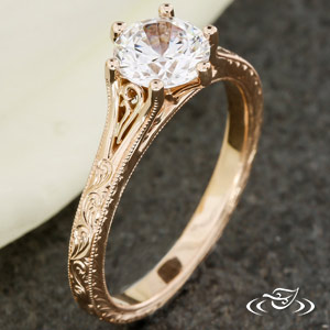 Platinum four prong setting with filigree top and side faces. Scroll hand engraving on top, half wheat sides with miligrain detailing. Pick the diamond or gemstone of your choice for this classic. Finger size 6.5