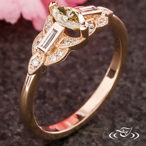 Custom 14kt rose gold ring holding round diamond center stone, with triple leaf detail and teal blue diamond bezel-set on each side face of the setting.