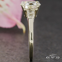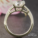 Two bezel set baguette diamonds frame a round four prong set diamond in this stunning classic engagement ring.