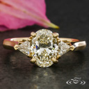 An oval diamond is framed by two trillion diamonds in this unique three stone ring.