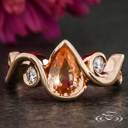 A peach pear sapphire is held in a flowing wrap setting accompanied by two round brilliant diamonds set in delicate rose gold curls.