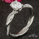 An oval diamond is held by four pointed prongs in this classic engagement ring with polished platinum and a bead set strand of diamonds intertwining to create the twist detail.