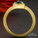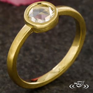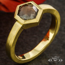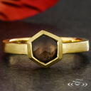 18k Fairmined yellow gold hexagon bezel design with free-form rose-cut pink Montana sapphire center stone. This ring has a flat profile and a brushed matte finish.
