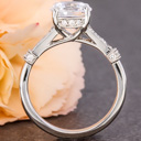 Four prong trellis setting with bead set diamonds on band and under bezel with milgrain details. Price may vary for larger center gems, Ask Your Designer for details. Customize with hand engraving or for other stone shapes