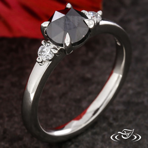 14kt Fairmined yellow gold three stone ring featuring 1.05ct round rose cut Salt and Pepper diamond with (2) accent rose cut diamonds totaling .09ctw.