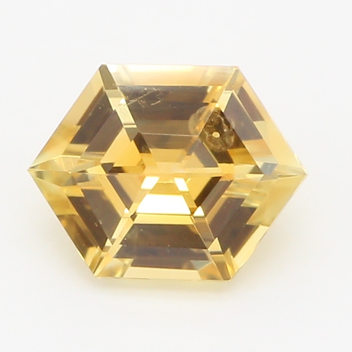 Custom 18kt fairmined yellow gold ring holding a 0.96ct bezel set hexagon shaped rose cut gray rustic diamond center stone. The remainder of the ring has a round slightly domed shank with a faint hammered texture.