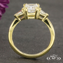 Classic 18kt yellow gold three stone ring holding a double 4-prong set radiant cut lab grown diamond center stone and (2) 3-prong set shield shaped diamond side stones on the top face.