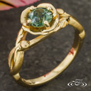This organic ring features a blooming golden poppy with a round Montana sapphire set at the center. The shoulders of the ring feature a twisting structure with accented with poppy leaves and pods. Hand-engraved details accent the soft matte finish.