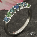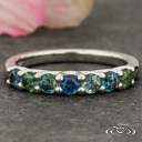 Custom 950 platinum band holding (7) round cut Montana sapphire melee of varying blue-green colors in shared prongs set in a row along the top ~third of the ring.