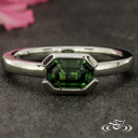 Custom 950 platinum solitaire ring holding a half bezel set emerald cut sapphire center stone set in an east/west orientation. This ring has a pierced window on the side face of the bezel, a round shank, and a high polish finish.