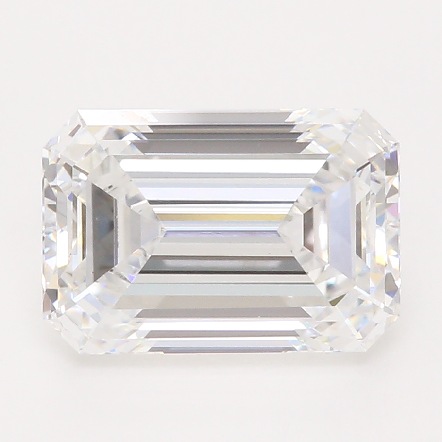 Two-tone three stone engagement ring holding (1) bezel set lab grown emerald cut diamond center stone flanked with (2) bezel set lab grown emerald cut diamonds all set asymmetrical on the band.
