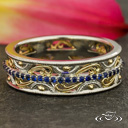 Delicate gold filigree curls create an alternating pattern with arcs of milgrain and golden beads. Eternity set blue sapphires create a line to mirror and reflect this intricate filigree pattern.
